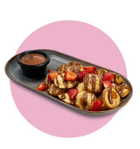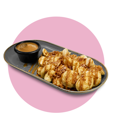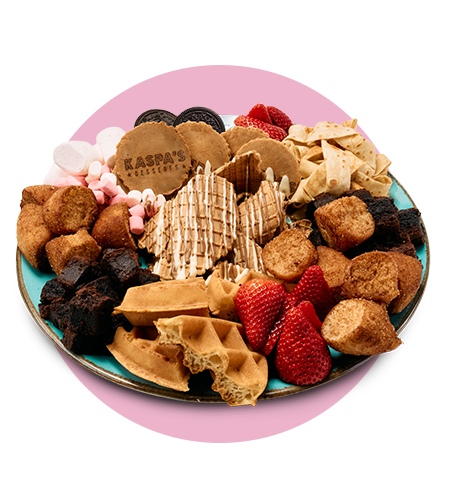 A shareable feast of Kaspa’s favourites: fluffy waffle, warm crepe, cinnabites, brownie pieces, jumbo & mini marshmallows, Oreo biscuits, Kaspa’s cones, fresh strawberries, and Kaspa’s wafers. Served with melted milk chocolate, white chocolate, and toffee sauce for dipping.