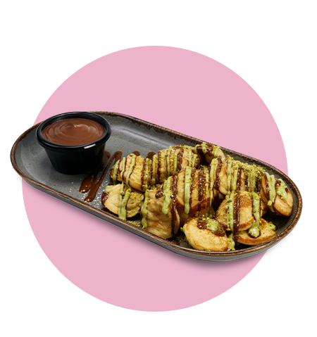 Fluffy mini pancakes drizzled with pistachio and choco-hazelnut sauce and finished with a spinkle of crushed pistachios.