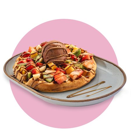 A base of fluffy, freshly baked waffle served with one topping of your choice and drizzled with choco-nut sauce.